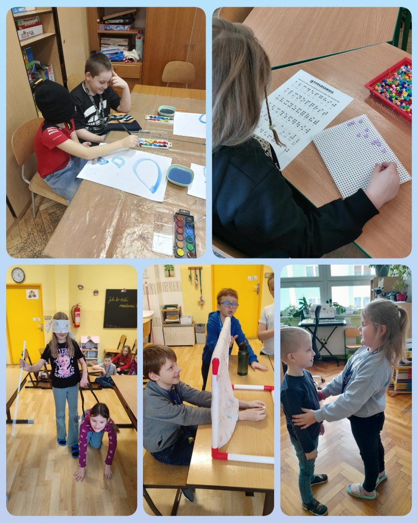 Ve druhém lednovém týdnu proběhl ve školní družině projekt s názvem „Jak to vidí nevidomí“. Cílem bylo přiblížit dětem svět lidí se zrakovým postižením a ukázat jim, jak důležitou roli hrají ostatní smysly. Děti si vyzkoušely chůzi se slepeckou holí nebo malování poslepu. Velký zájem pak přinesly smyslové aktivity, při kterých děti poznávaly ovoce podle chuti, koření podle čichu a různé předměty či kamaráda pomocí hmatu. Součástí programu bylo také seznámení s Braillovým písmem.
